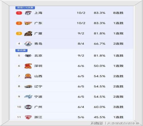 CBA最新排名榜:上海傲视群雄,广厦广东紧随其后,辽宁掉出前八